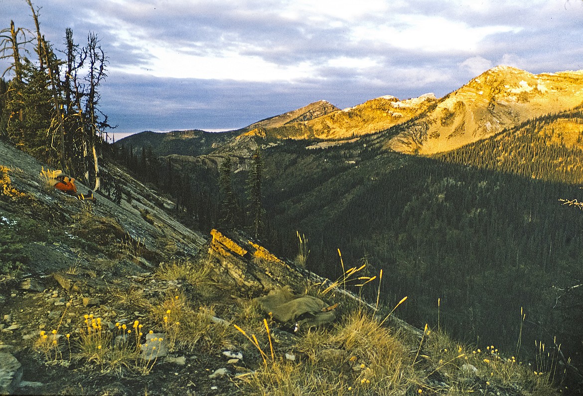 The Dry Creek road, rough, but open back then, switchbacked up from the Bull River Highway, gaining most of the elevation through cut over spruce forest. Early one fall during my parent’s annual visit to see the grandkids, I took my dad up there in our ‘53 Willys Overland. We iked to the ridge (his first time under a backpack, I think) and camped near a vantage point looking across the upper South Fork at Sawtooth Mountain.