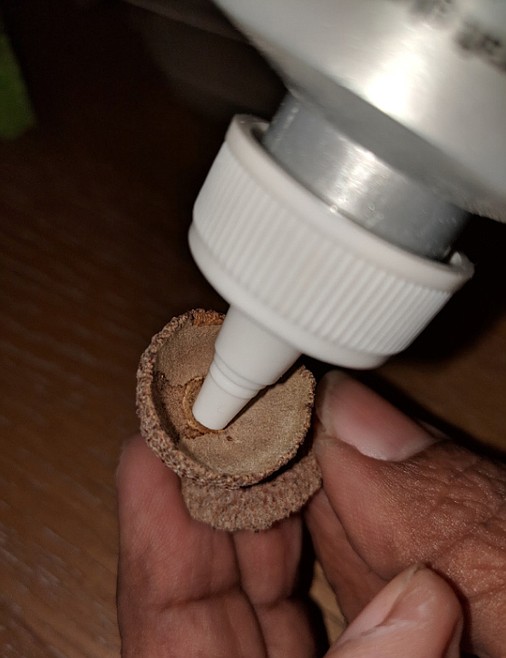 3. Take a small amount of fibre and roll it as tight as possible. How much fibre you need will depend on the size of your acorn caps. Keep in mind, the fibre will shrink some during the felting process. Do not let it go.