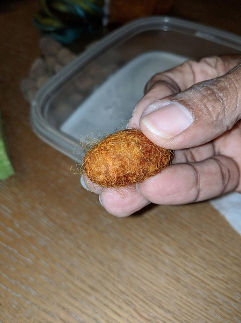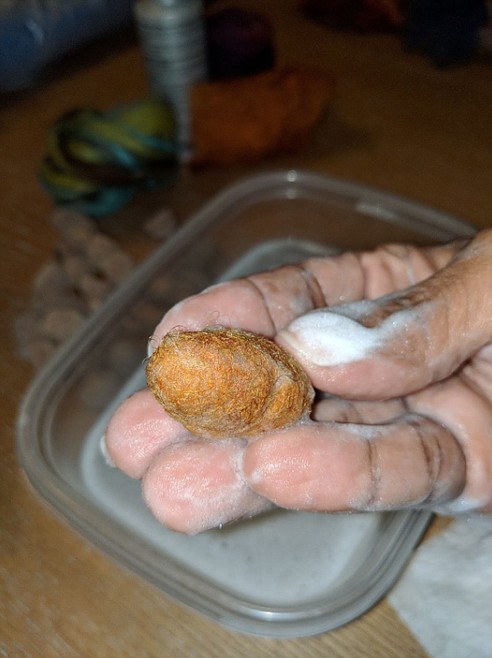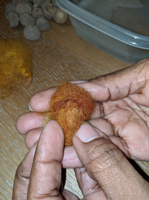 5. Hold the fibre with one hand and start squeezing and rubbing it with the other hand. This will begin the felting process. Then switch hands and do the same thing. Continue this process until it feels firm enough to roll it in your hands. Once it is firm enough to roll then you can continue squeezing, rubbing and shaping on all sides. Your goal is for your felted acorn to resemble the shape of an egg.