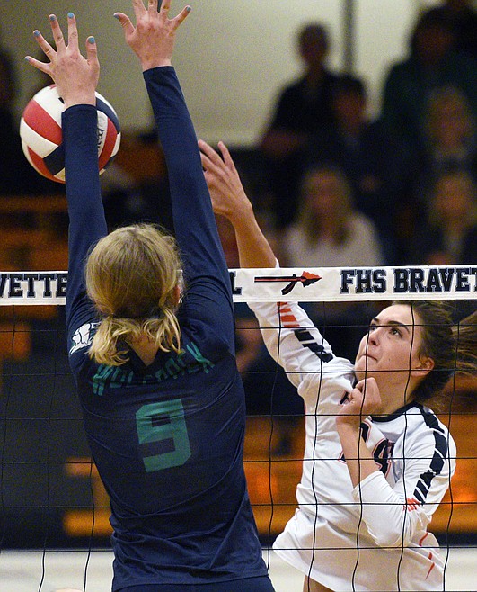 Flathead's Taylor Henley (24) closes out the second match with a kill against Glacier's Kali Gulick (9) during a Western AA playoff at Flathead High School on Thursday. (Casey Kreider/Daily Inter Lake)