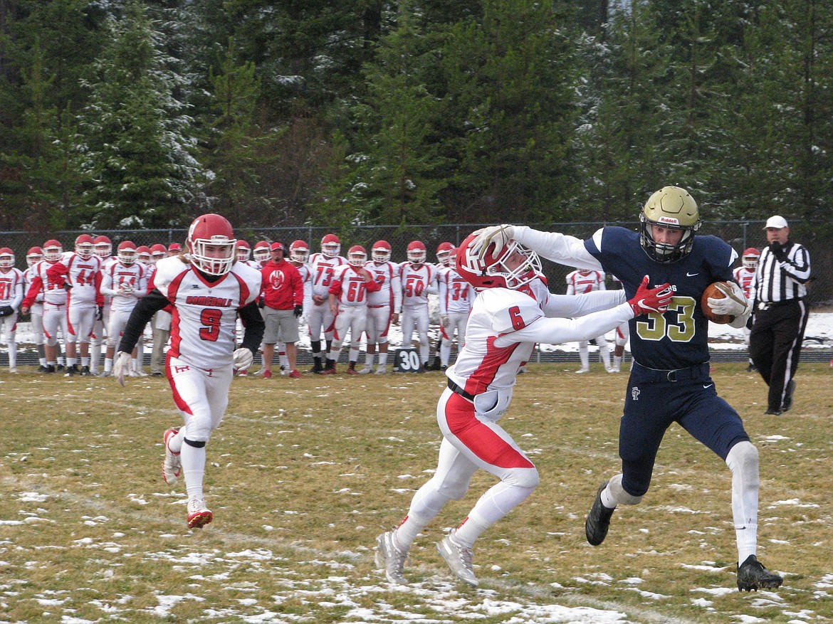 On the game’s first possession, Timberlake drove the ball deep into Homedale territory, where on fourth and 8 at the 15, Follini scrambled but came up inches short of the first down. Homedale went 92 yards in nine plays, Kincheloe rumbling the final 10 for a 7-0 lead.