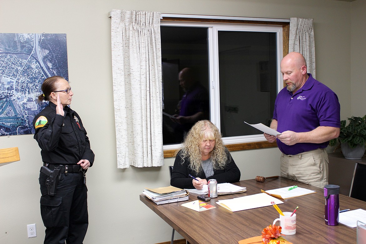 After addressing some initial items on the agenda, mayor Bob Jutlia did the honors as Holdahl raised her right hand and took the oath.