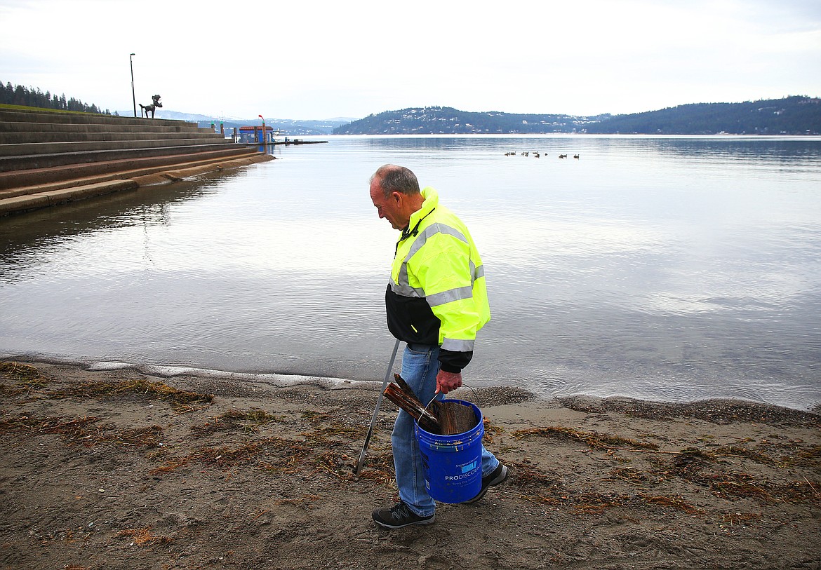 City parks and recreation employee Mike Kempton and fellow workers policed the casings from the beach Monday afternoon, quietly walking the quarter-mile stretch, back and forth, plinking each casing into buckets, along with chunks of wood debris and cellophane wrappers.