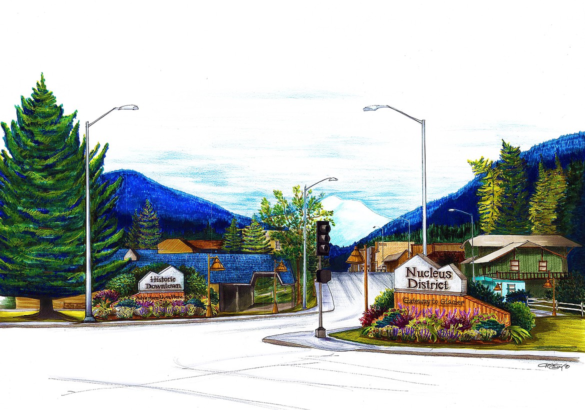 Designed by Bruce Lutz, the 12-foot tall, 20-foot wide signs are being manufactured by Glacier Precast Concrete, Inc. in Kalispell and will be made to look like stone. Both will feature steel lettering that says “Nucleus District” while the sign of the west side of the street will say “Adventure Lives Here” with the Columbia Falls logo and the east sign will say “Gateway to Glacier.” The pair will also feature a corrugated steel skirt that will rust over time, a surrounding bed of native flowers and plants and a lighting system to illuminate them at night.