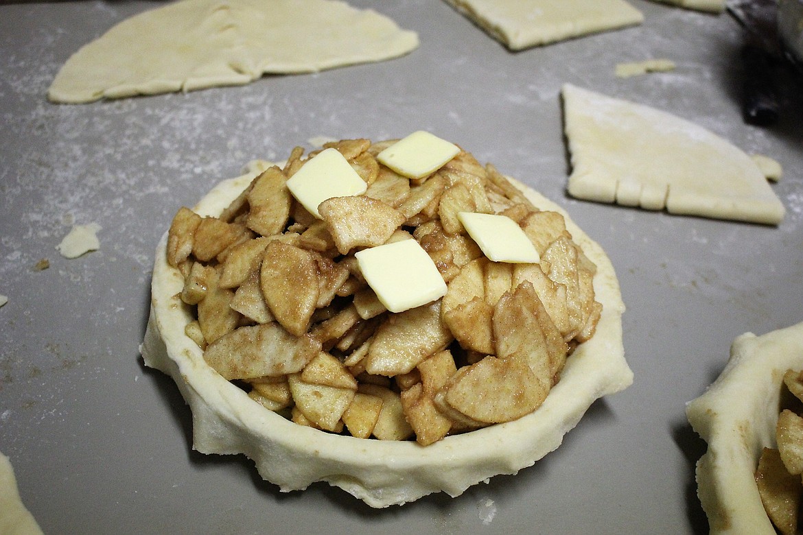 At a long table near the wall, nearly half a dozen other bakers were making and rolling out pastry. The floor was slick with a thin layer of flour as they rolled out the dough and fitted it into a tin. Then the tins were filled with a five-cup mound of apples topped with pats of butter. Then covered with another piece of pastry, fluted around the edge.