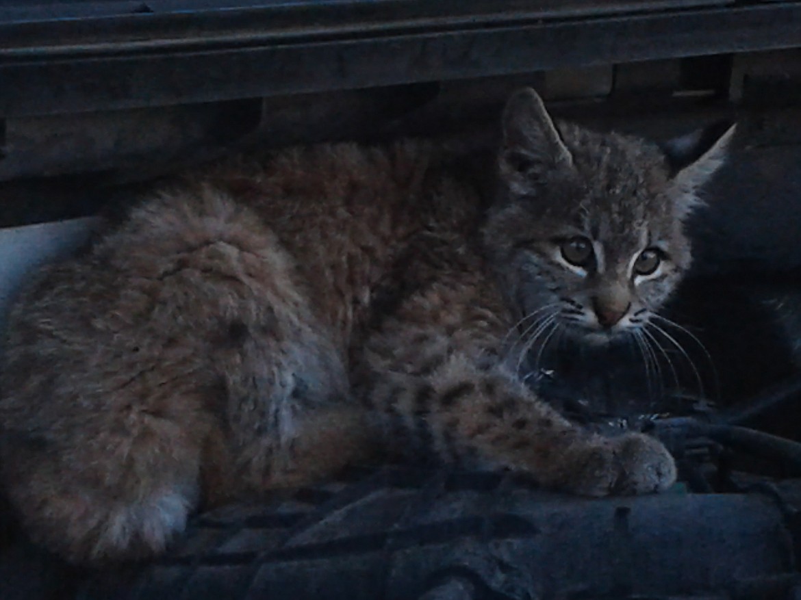 The wild cat started to run away, but then it crawled into the engine compartment of Grytness’ truck, and he was able to open the hood and remove the little animal.