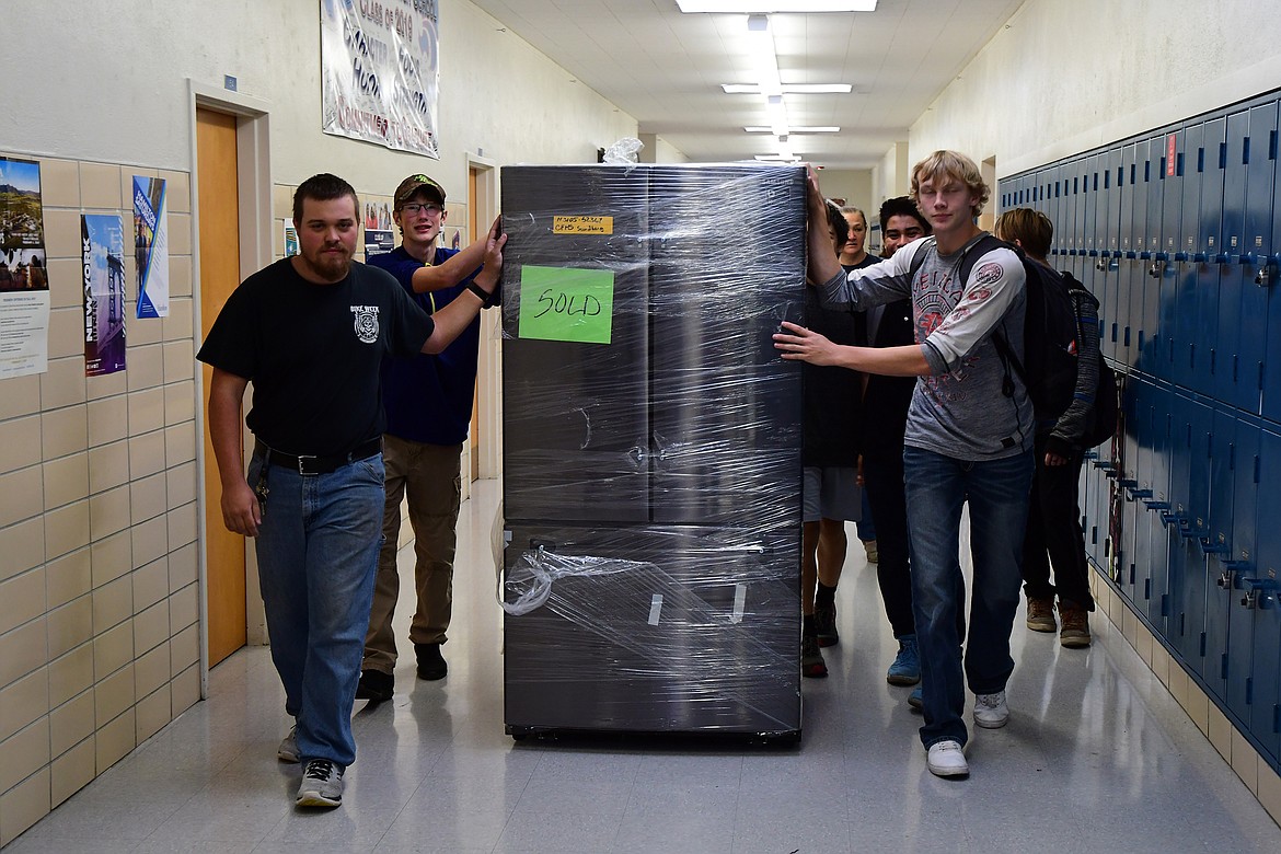 High School Principal Scott Gaiser came to the rescue, suggesting the new fridge be placed in an unused space adjacent to the High School cafeteria. With the help of students Cole Berger, Hunter Ryan, Zack Grey, Gabe Sanchez, Beau Douglas and Alex Knapton, the refrigerator was placed in its new home.