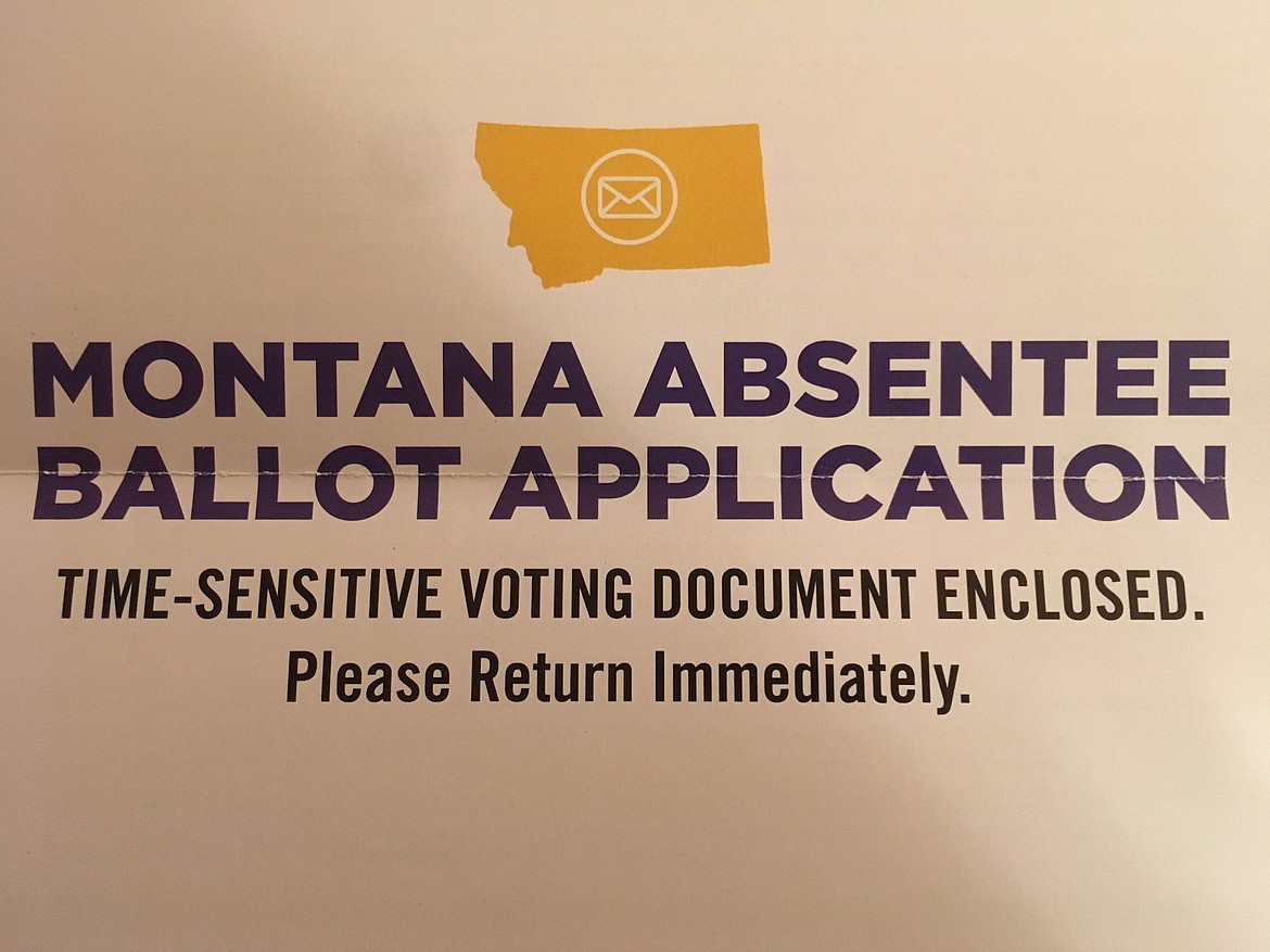 Kalispell resident Susan Cahill, her husband and son received the absentee ballot applications Tuesday in mailers paid for by the New American Jobs Fund, according to the envelopes. The mailers encouraged recipients to vote absentee and included a postage-paid envelope addressed to Flathead County Clerk for the completed applications.