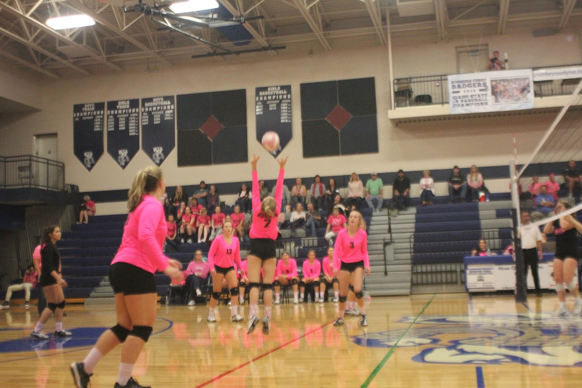 BONNERS FERRY — On Oct. 2, the Badgers volleyball girls entered the Bonners Ferry High School gym wearing pink uniforms. The ‘Dig Pink’ event was hosted by the Badgers, with visiting team Clark Fork also dressed in pink. The stands on both sides of the gym were filled with pink shirts by visitors, the band, and the cheerleaders.