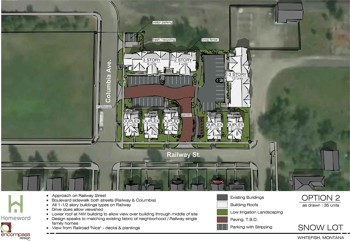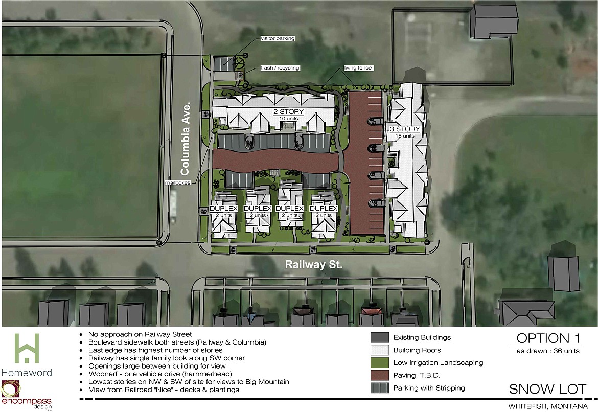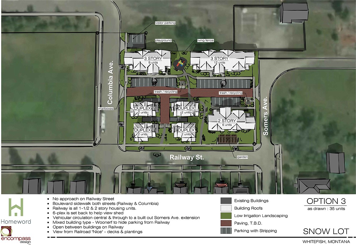 Option No. 3 clusters four duplex units to the southwest corner of the snow lot and places a two-story building nearest the southeastern corner at Railway and Somers. At the northern most part of the lot would be two three-story buildings. Road access would come off Columbia Avenue and an extension of Somers Avenue. Currently, Somers Avenue is only constructed to the north to Railway Street. Homeword is encouraging the city to pursue gaining the ability to extend the road north, which requires obtaining permission from BNSF railway.