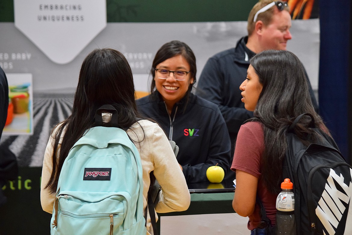 The SVZ booth is busy as Othello High School seniors wander around, and Frias cheerfully explains what her company does to all who show an interest.