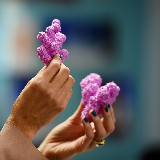 Shelley Emslie displays examples of 3-D-printed coral reef pieces.