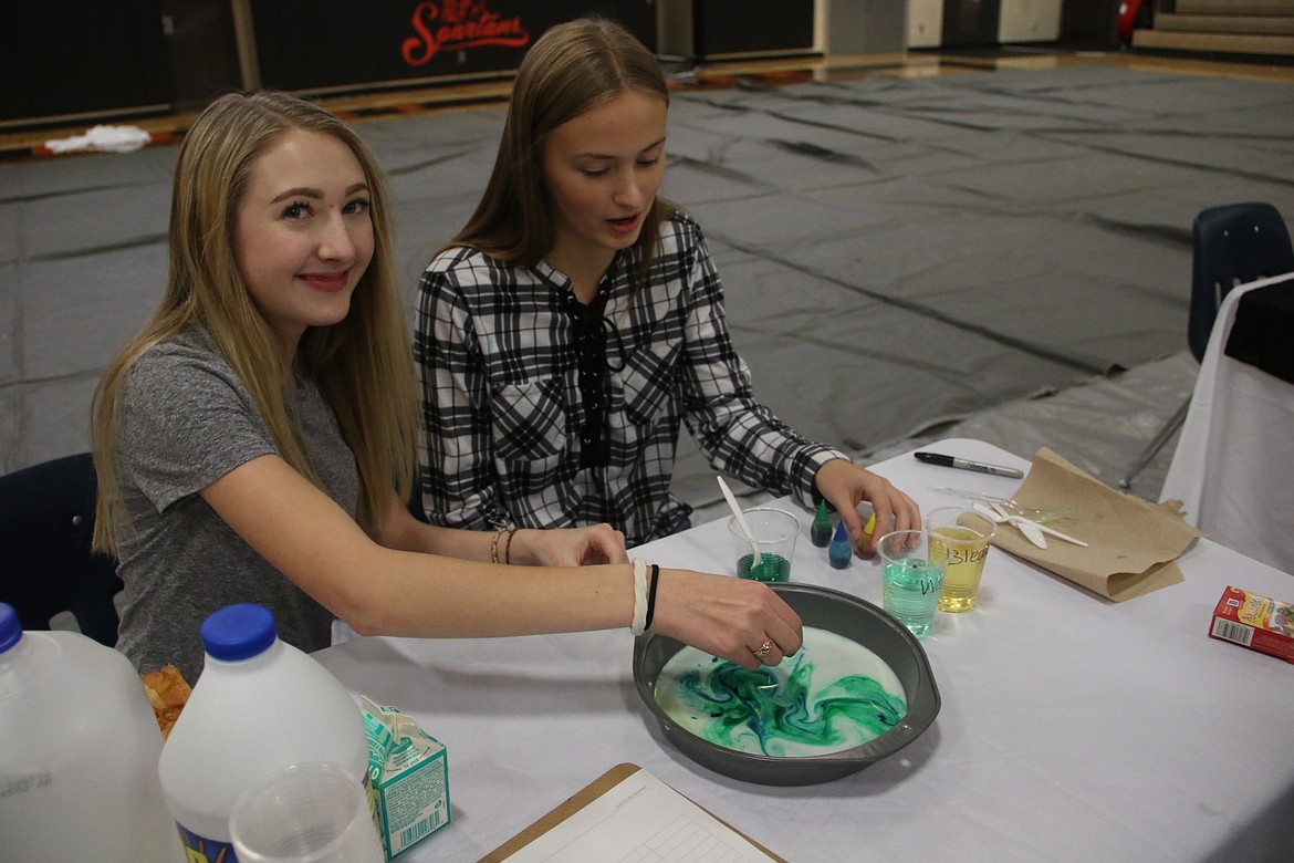 It disappears, of course. Priest River Lamanna High School students Sarah Bach and Carmen Needs recently demonstrated how food coloring reacts in different liquids, with a focus on creating abstract art. For example, when they added different colors to a pie pan full of milk, they could then swirl the colors around to create colorful patterns. The demonstration to students, parents, community members, and county and state candidates was part of an event Thursday, hosted by the school’s 21 Century Community Learning Center Agoge.