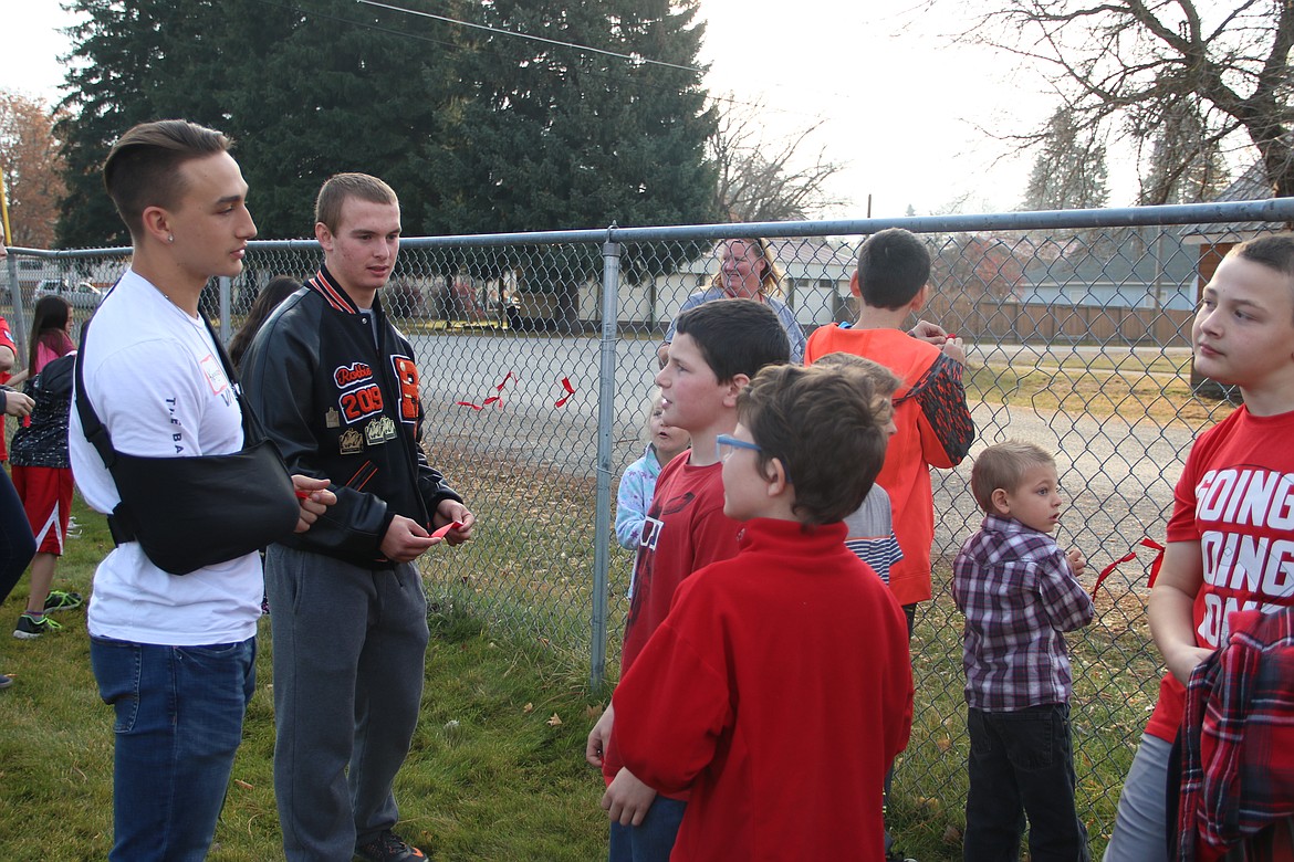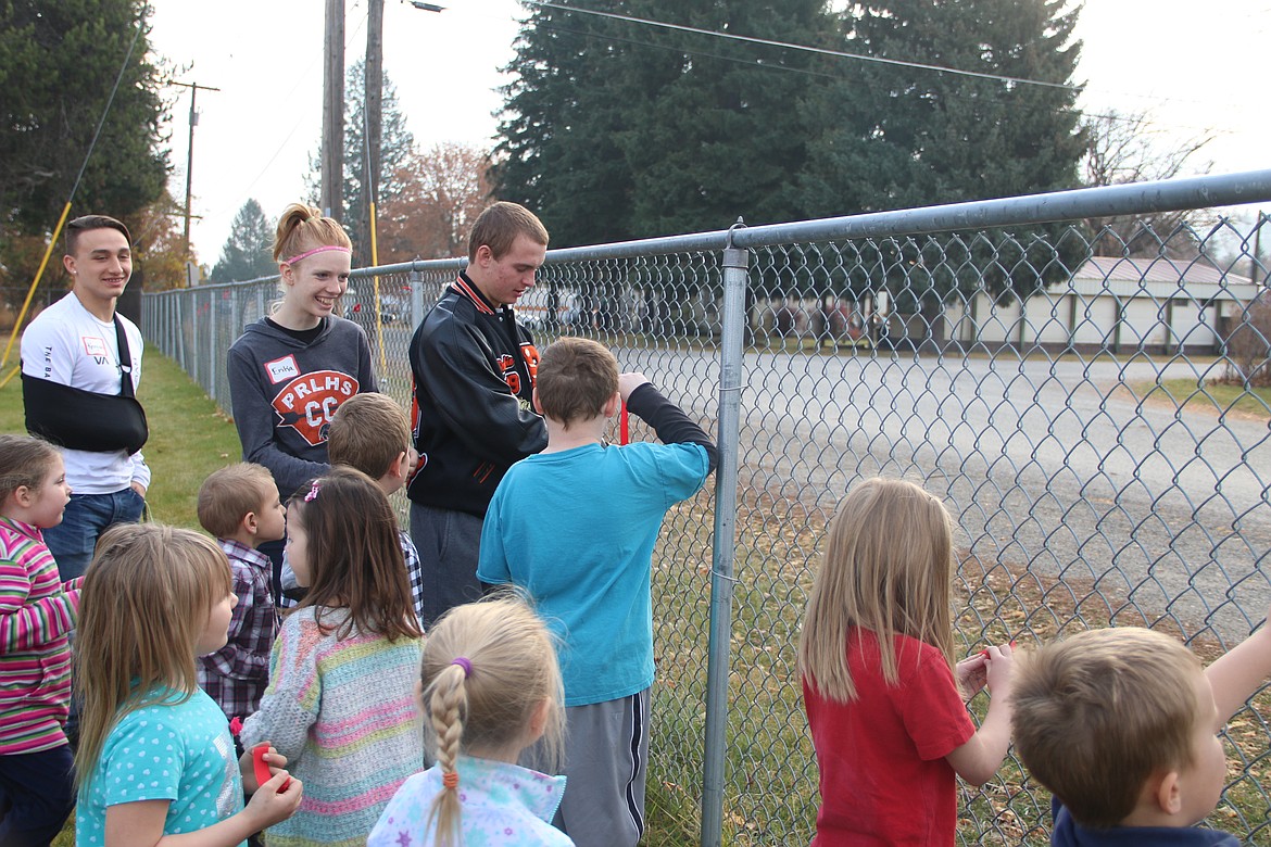 Three Priest River Lamanna High School students greeted the kids to help them tie their ribbons to the fence in honor of National Red Ribbon Week.