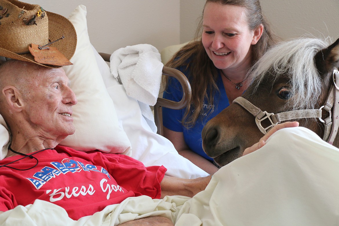 Mary Lynch teared up watching as Jellybean was walked over to Bob’s bed, nuzzling closer as he reached out to pet the miniature horse’s mane, his fingers threading between the strands of hair before rubbing behind her ears. As his eyes drank in the sight of the horse at his bedside, Jellybean dropped her head onto the sheets and rested it by Bob’s side.