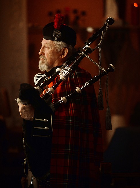 Portrait of Doyle Carr, of The Montana Highlanders Association Bagpipe Band, on Thursday, March 15, at St. Matthew’s Catholic Church in Kalispell. (Brenda Ahearn/Daily Inter Lake)
