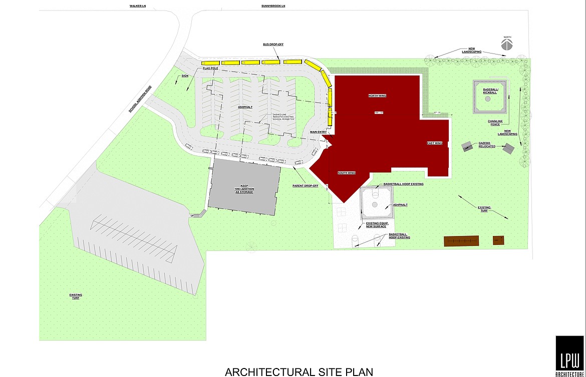 These initial plans included building a new addition to the existing school while expanding a wing constructed in 1993, then demolishing two older wings constructed in the 1950s and 1960s. The problematic soils were located north of the 1993 wing, where a hillside leads to a lower parking lot. Issues were raised about a two-story section that was to be built into the hillside.