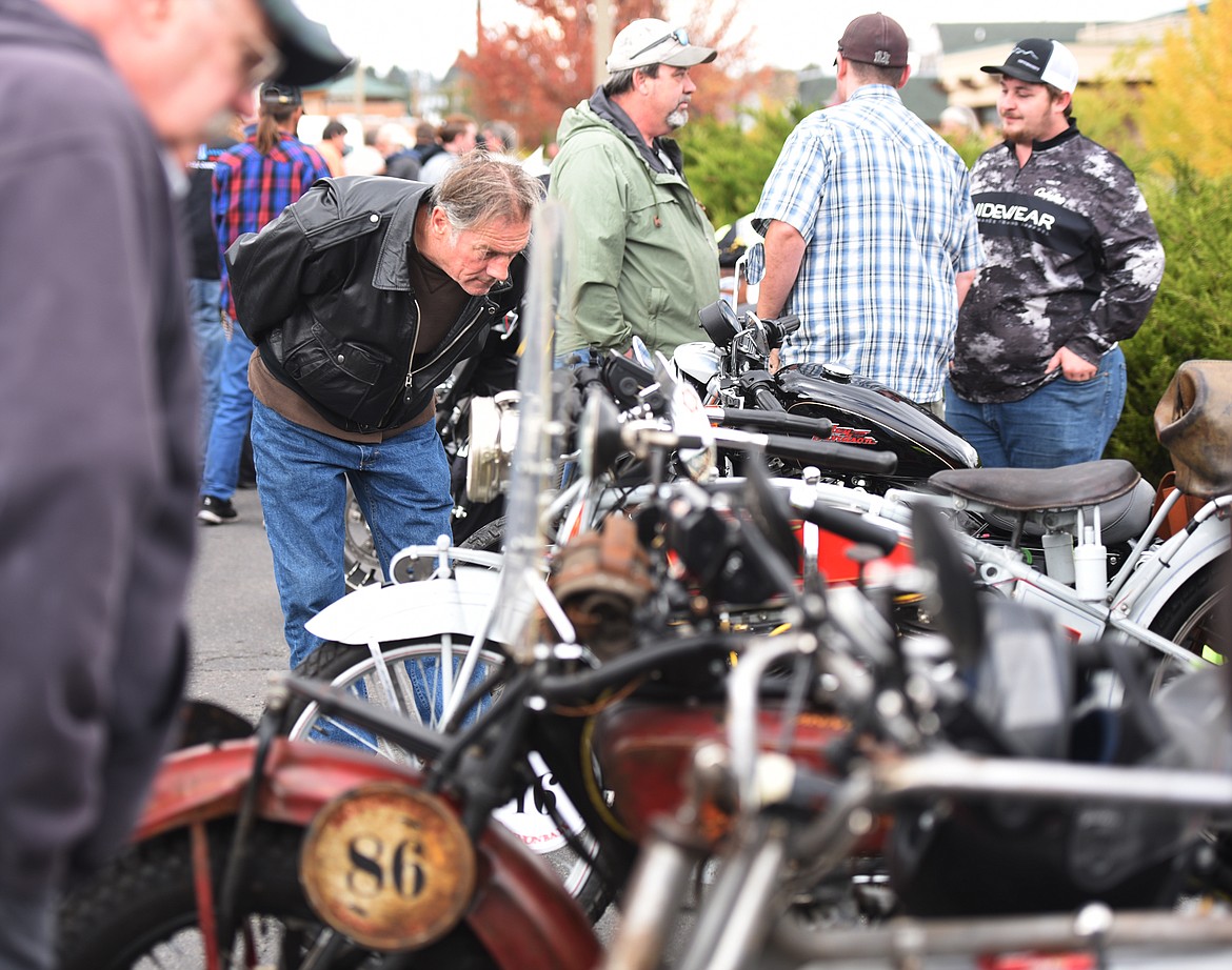 Erik Bahl of Huntsville, Alabama talking with fellow motorcycle enthusiasts on Thursday evening, September 20, at the Pre 1929 Motorcycle Cannonball Endurance Run checkpoint at the Red Lion Hotel. The run began in Portland, Maine and wraps up in Portland, Maine.(Brenda Ahearn/Daily Inter Lake)
