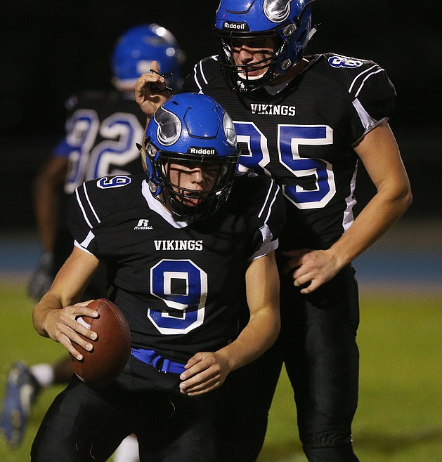 Kale Edwards passed for 244 yards and three touchdowns, and rushed for 115 yards and three scores for Coeur d’Alene (5-0). Shilo Morgan ran for 141 yards, and caught a pair of TD passes. Together, they had all 256 of the Vikings’ rushing yards.