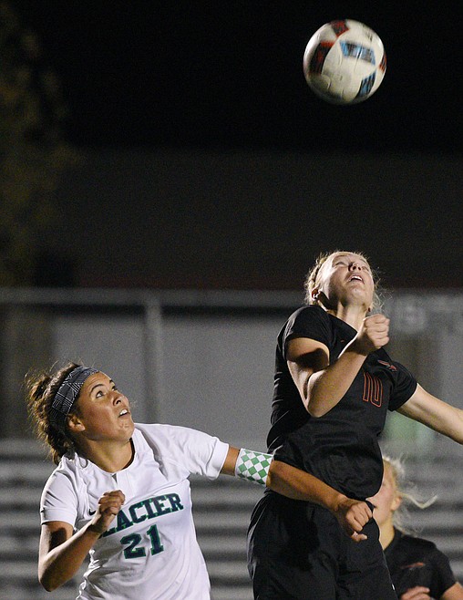 Glacier's Micah Hickethier (10) heads the ball upfield in front of Flathead's Chloe Nadeau (11) during a crosstown matchup at Legends Stadium on Thursday. (Casey Kreider/Daily Inter Lake)