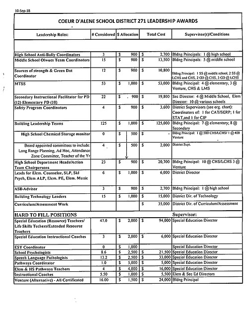 COEUR d’ALENE — Leadership premiums paid to Coeur d’Alene School District teachers and staff this year will amount to approximately $514,800. The school board approved this year’s estimated schedule of leadership premiums during its Sept. 10 meeting.