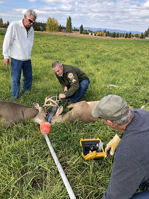 Two large, 5x5 bucks locked antlers in a field between Kalispell and Whitefish near resident Lee Terry’s home sometime Thursday night. When Terry discovered them Friday, one had already died while the other was nearing complete exhaustion.