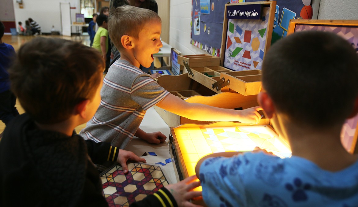 "It's awesome," said first-grader Asher Smith as he contemplated where to place polygons to cover a light board with a tessellation mosaic.