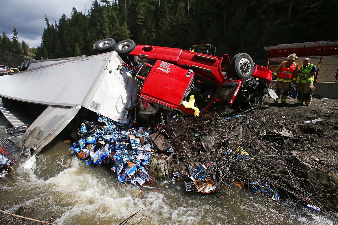 A semi hauling a variety of beer in cans and bottles tipped over on westbound Interstate 90 while coming down Fourth of July Pass east of Coeur d'Alene at 12:22 p.m. Wednesday.