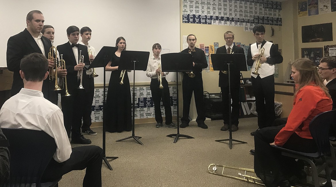 Band Ensembles — Jazz Combo (Armstrong, Nathan DePoe, A. Frissell, B. Frissell, Hobbs, Martinez, Mesa McKee, Morrison, C. Nowlin, Young); Trumpet Choir (Cameron Alexander, Brett Bennett, Jarod Calley, DePoe, Braedon Illif, Martinez, Carter Nowlin, Megan Rost, Brian Siemens); Trumpet Trio (Jarod Calley, Joseph Martinez, Brian Siemens); Trumpet Duet (Brian Siemens, Rost); Trumpet Duet (Martinez, Rost); Trombone/Trumpet Duet (Beatrix Frissell, Joseph Martinez); Clarinet Trio (Adeline Day, McKee, Xavier Pierre); Brass Ensemble (B. Frissell, Kaitlyn Lamphere, Martinez, Siemens, Halli Tyler); Trombone Quartet (B. Frissell, Hillary Lamphere, Halli Tyler, Steven Wolfe); and Flute Trio (Mossy Kauley, Hailie Purdue, Simshaw)