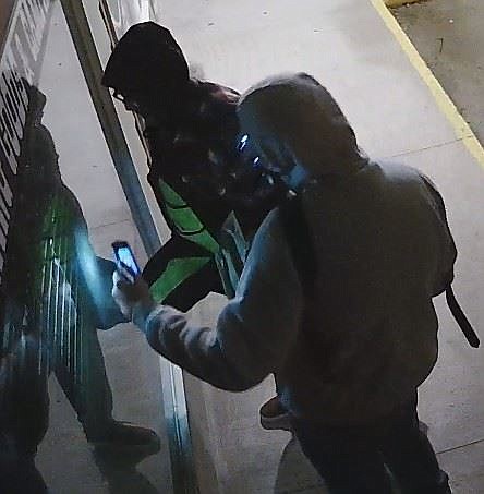 The two individuals caught on camera were wearing masks and had the hoods on their shirts up. They were also wearing backpacks, with the packs hanging in front of them and open.