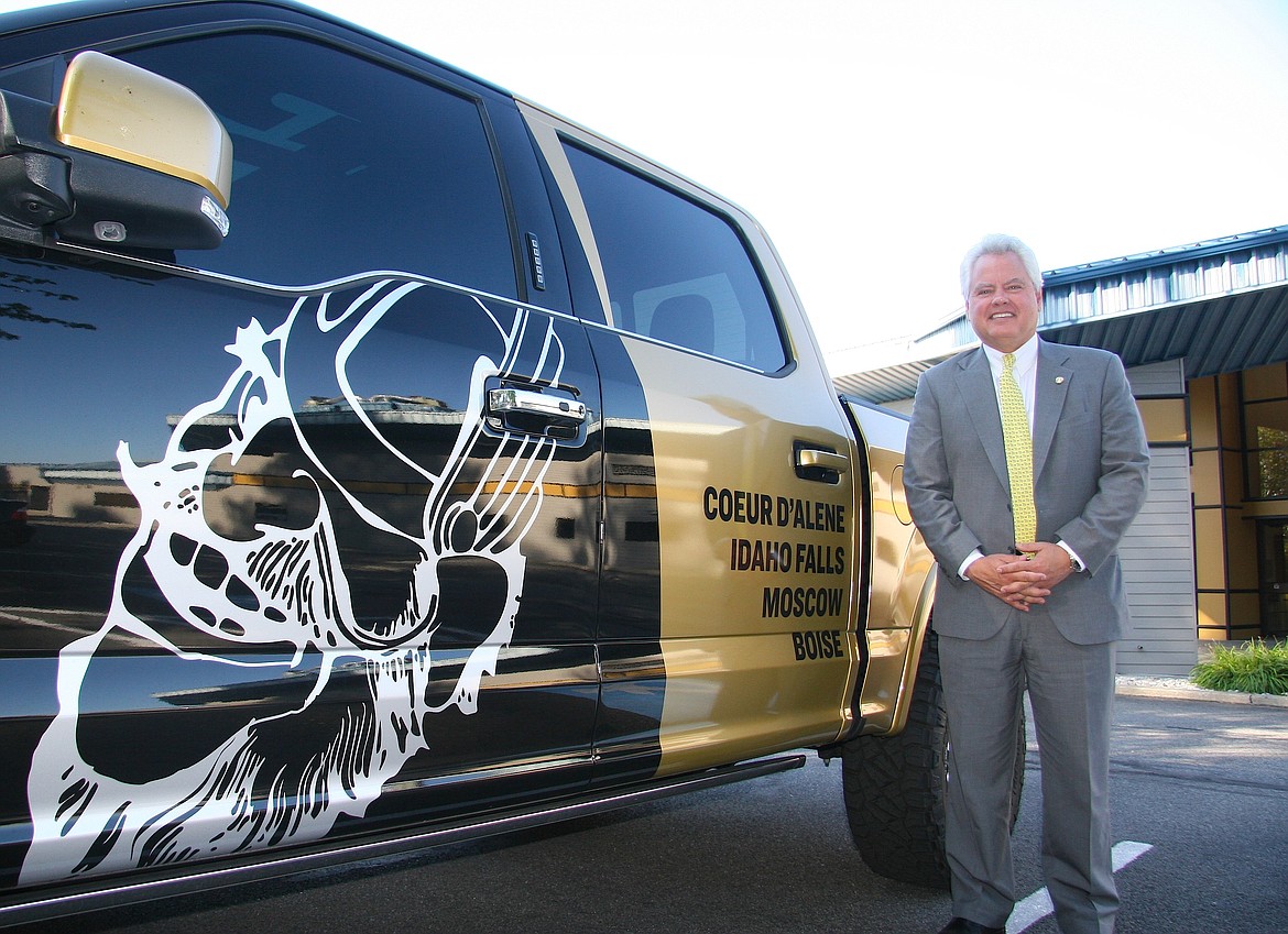 UI mascot Joe Vandal is with Green everywhere he drives: His personal truck, a gold and black Ford F-150, has Joe and UI locations on its side.