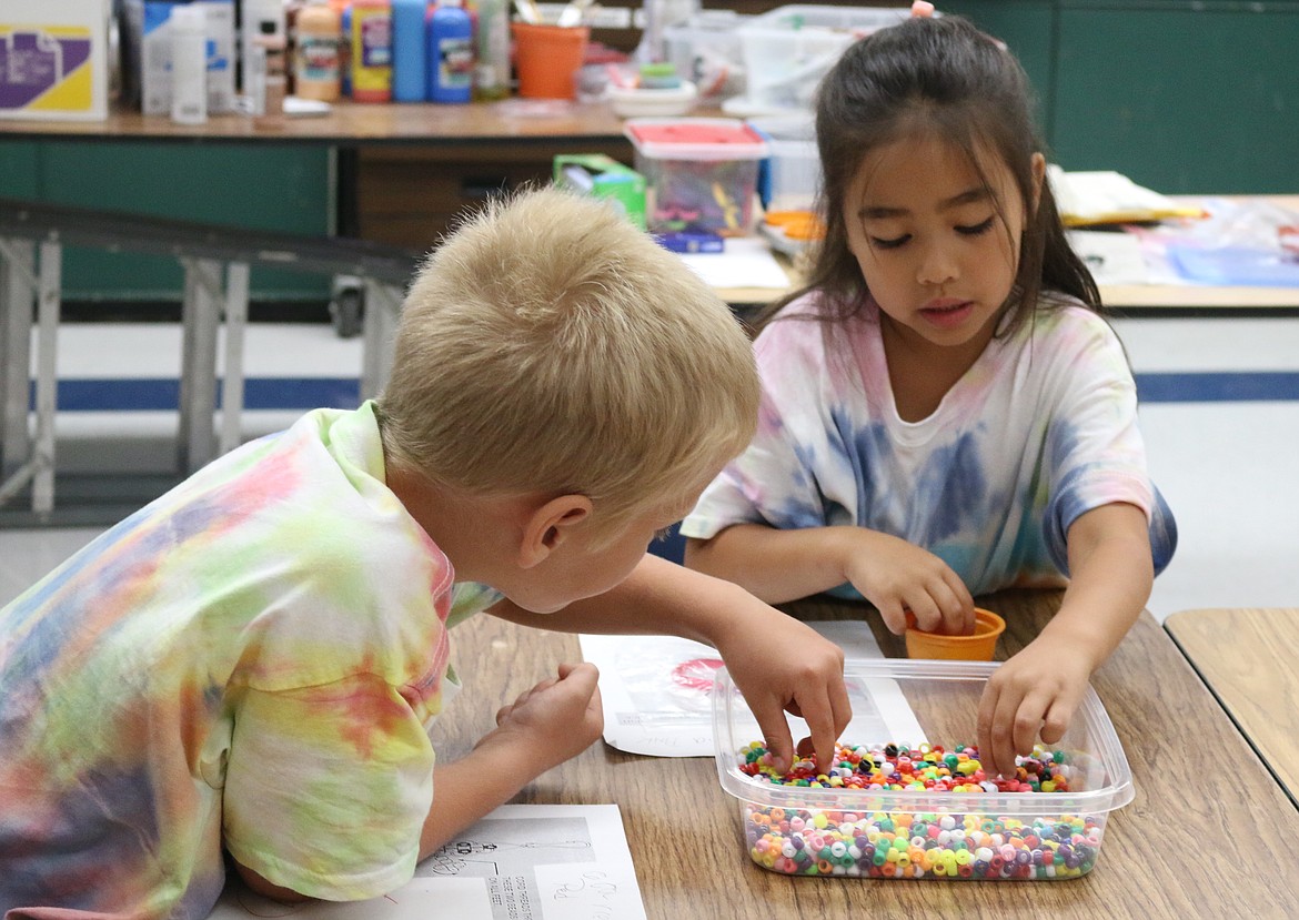 Each of the five days last were done in the order of STEAM — science on Monday, technology on Tuesday, engineering on Wednesday, art on Thursday, and math on Friday. Some of the activities in the area of science included bubble painting, magnetism, Newton’s Laws of Motion, tie-dye science, states of matter, chemical reactions and senses science. Technology included robotics and coding. On Wednesday, for engineering, the kids each made a Newton’s cradle and a Ferris wheel from Popsicle sticks, as well as participating in BrickLAB engineering, balancing frogs and other engineering design process activities. Art included painting, tie-dye, bookmarks made from old books, and Critter Beads. Math activities included coding, counting, measuring, estimating and Lego math. Some of the activities, such as Critter Beads, were a crossover between art and math, as art was actually implemented each day of the camp.