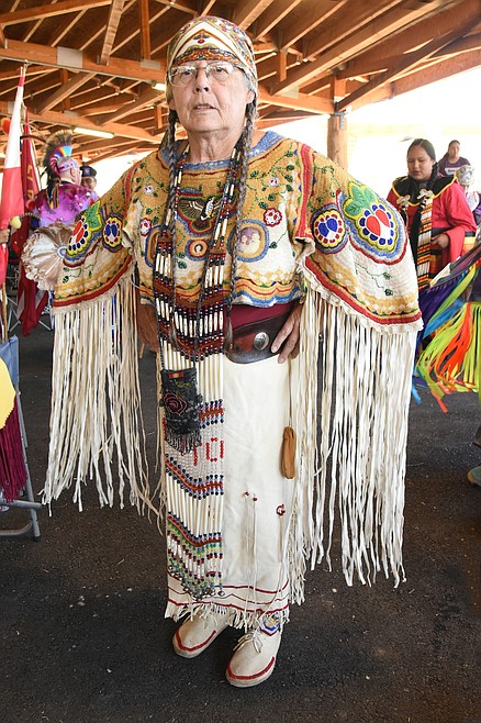 Some of the regalia worn by the dancers was traditional — buckskin and beading, feather bustles, fans, hats and headdresses — while others wore brightly colored clothing and headgear.