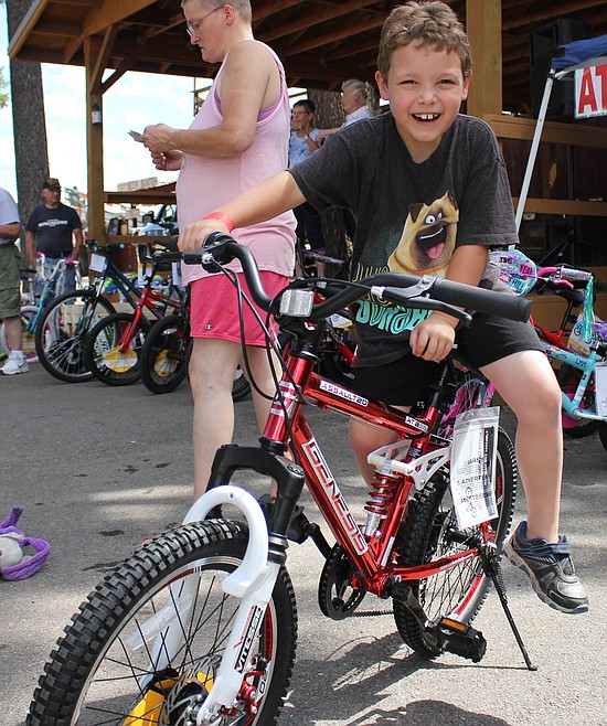 Kameron Meeks, 7, of Superior wins a bike at the bike, fishing pole and tent raffle at the fair on Saturday. (Maggie Dresser/Mineral Independent)
