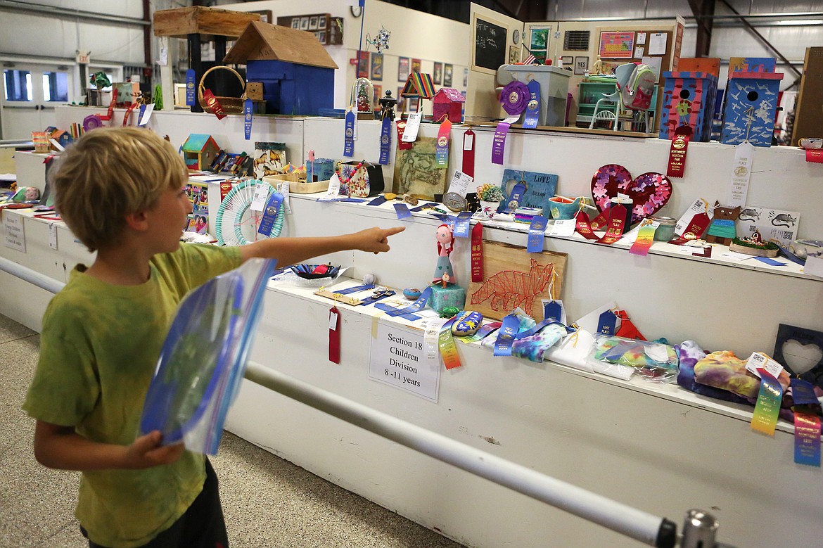 By mid-afternoon Tuesday a selection of crafts had already been judged and the boys walked through the Expo building to see how their creations had fared. Jacob pointed to a few of his pieces, which were adorned with ribbons in various hues, including blue.