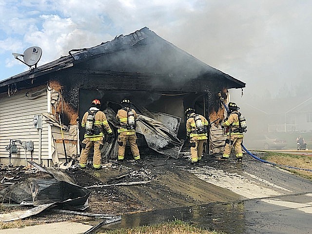 The fire at 3600 Jordan Drive, north of Mullan Avenue and west of Highway 41, was reported by neighbors at 10:56 a.m. and the first crews arrived 2 minutes later to flames rising from the garage. Firefighters remained on scene until about 3:30 p.m.