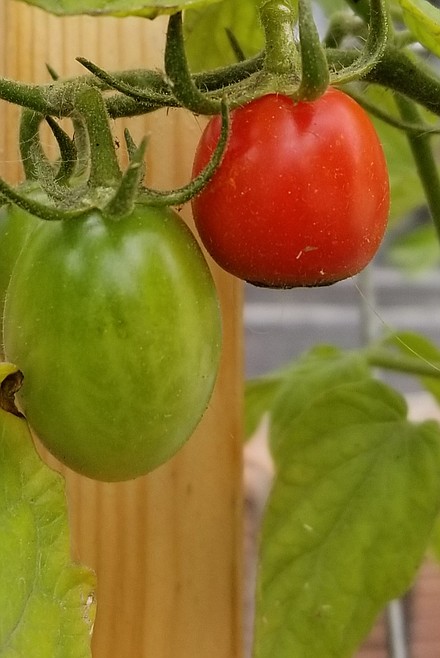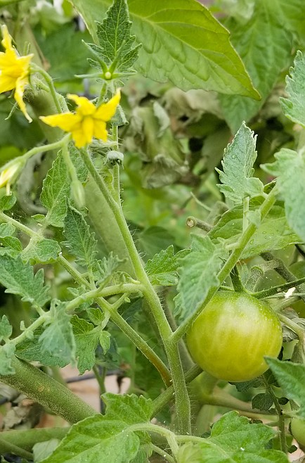The gardens in front of the library fared fairly well. They are currently growing tomatoes, but they had lettuce earlier in the season.