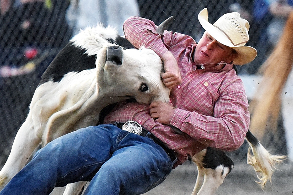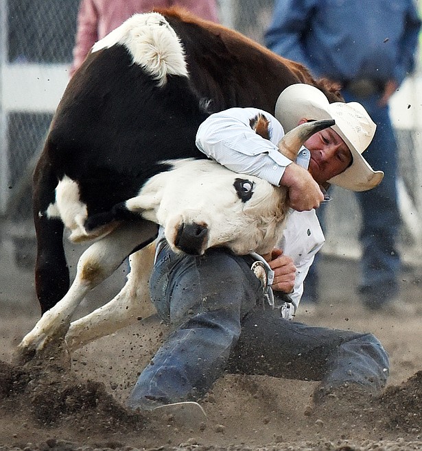 Ross Mosher, from Augusta, Montana, wrestles his steer to the ground during steer wrestling at the Northwest Montana Fair PRCA Rodeo at the Flathead County Fairgrounds on Saturday. (Casey Kreider/Daily Inter Lake)
