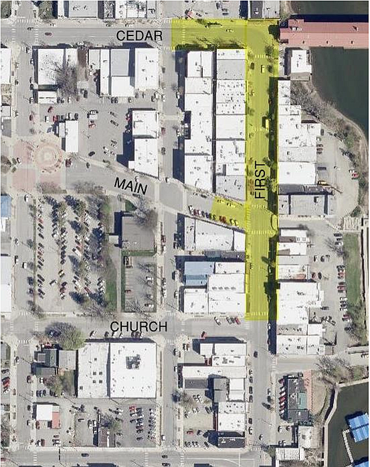 Wilson said screens will be placed on fencing along the streets to help block the businesses from the construction zone, as well as keep the dust down. Banners will go up at each end of the construction area as well, one on First and one on Cedar, letting people know the businesses are open. There will be opportunities for businesses to place signs on the fencing as well. Also, there will be three designated crossings, located at First and Church, First and Main, and Second and Cedar.