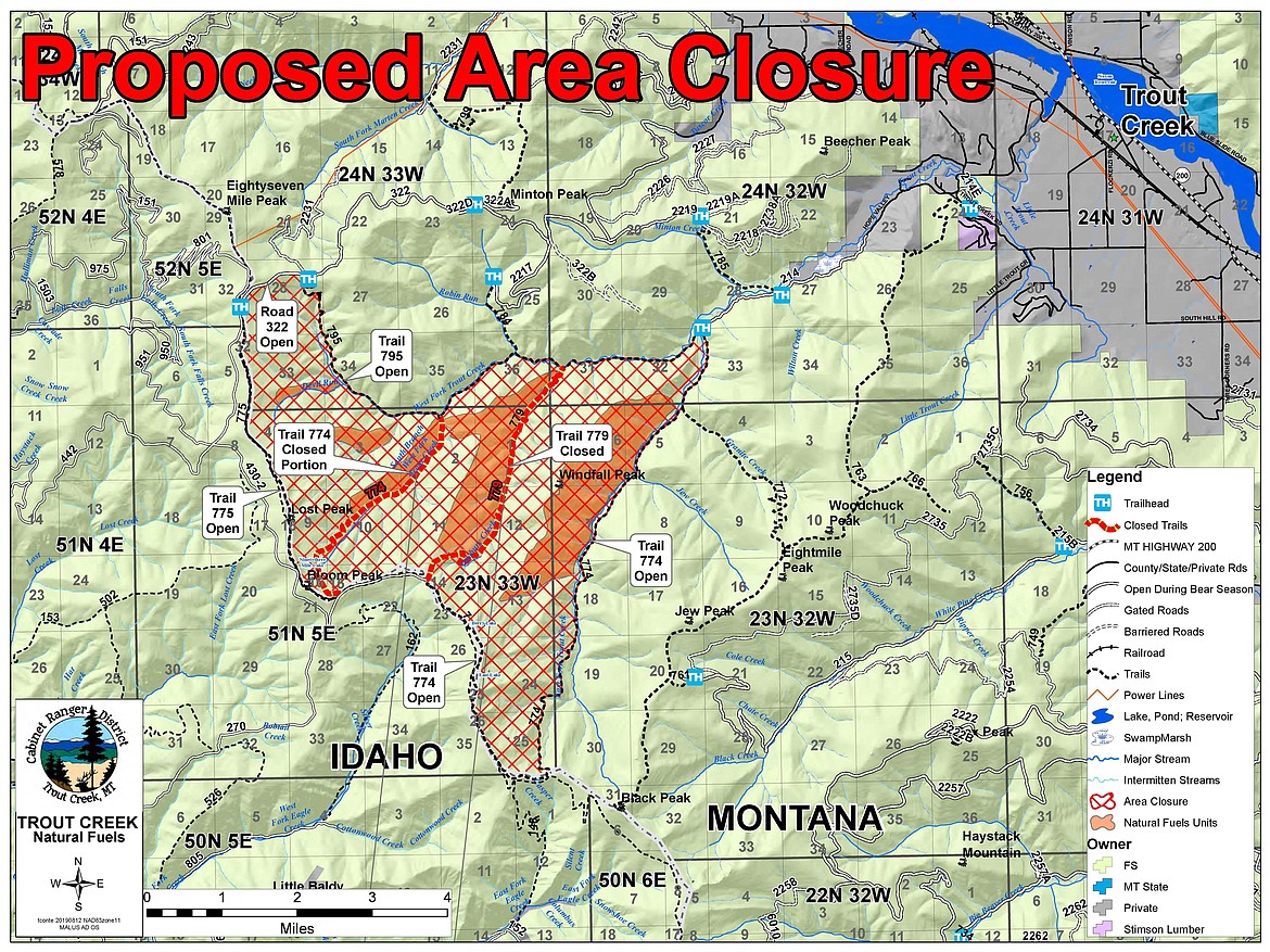 A temporary trail and area closure will be implemented for public and firefighter safety during prescribed burn activities. The area closure will be rescinded when fire behavior is minimal or significant precipitation has occurred in the prescribed fire area. The temporary area closure will include the main stem, south branch, and west fork of Trout Creek. The temporary trail access closure will include Trail 774 from the Idaho border to the junction of Trail 795 and Trail 779 from the Idaho border to Trail 774.