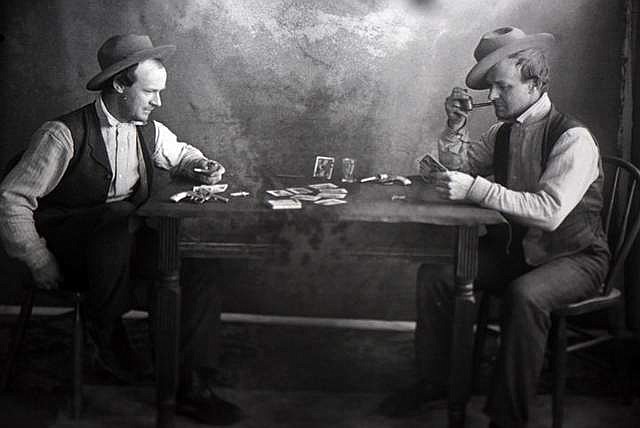 Then there are many images that captured the spirit of an entire community — one of a few dozen people gathered in front of a home for the holidays, children lined up in front of a school, cozy living room get-togethers, summers at the local swimming hole, and portraits of Eccles himself with some, like the one of him playing cards against himself, unveiling glimpses of his humor and personality.