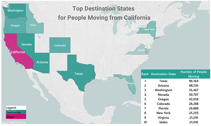 Although the primary origin of newcomers to Idaho last year was California, which accounted for 26 percent out of the total number of new residents, Idaho is 10th on the list of destinations for outgoing Californians. More Californians choose Texas and Arizona than other states, and Washington, Oregon, Nevada and Colorado are chosen over Idaho, Aura Mogosanu of Storage Cafe said.