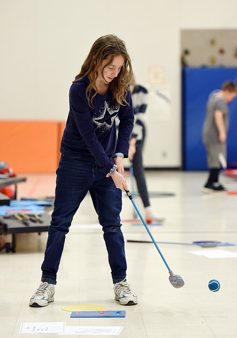 Nearby, another group of students formed lines behind bulls-eye targets laid on the floor. Students took turns tossing the balls underhand with the goal of hitting the center of the target. Mumm said the activity is a progression to golf chipping, where students will learn to take full swings with wedges, a heavier and wider club.