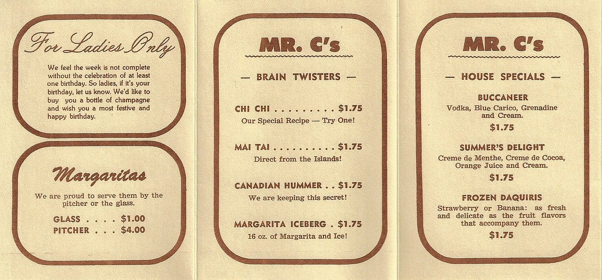 To encourage “Ladies” to enjoy Thursday nights at Mr. C’s on Main Street, a tri-fold drink menu for the table tops was printed in the Herald Print Shop on June 22, 1977; 500 menus were ordered at a cost of $28.50.