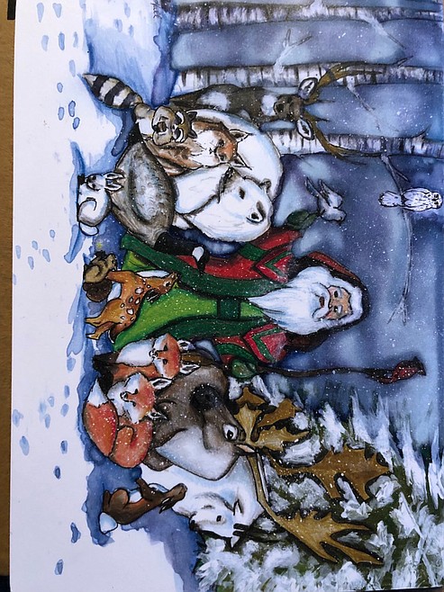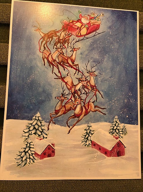 Recipients of Fidelity National Title’s Christmas card this year can see Hall’s signature style in the animal imagery on the card, which shows Santa Claus and his reindeer descending over a snowy landscape dotted with evergreen trees and red barns.