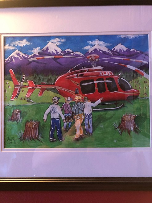 Her winning drawing shows two deer running away from a forest fire as firefighting planes drop flame retardant on a fire. This year, she won the competition again with a drawing of an injured logger being loaded onto the ALERT helicopter with snow-capped mountains in the background.