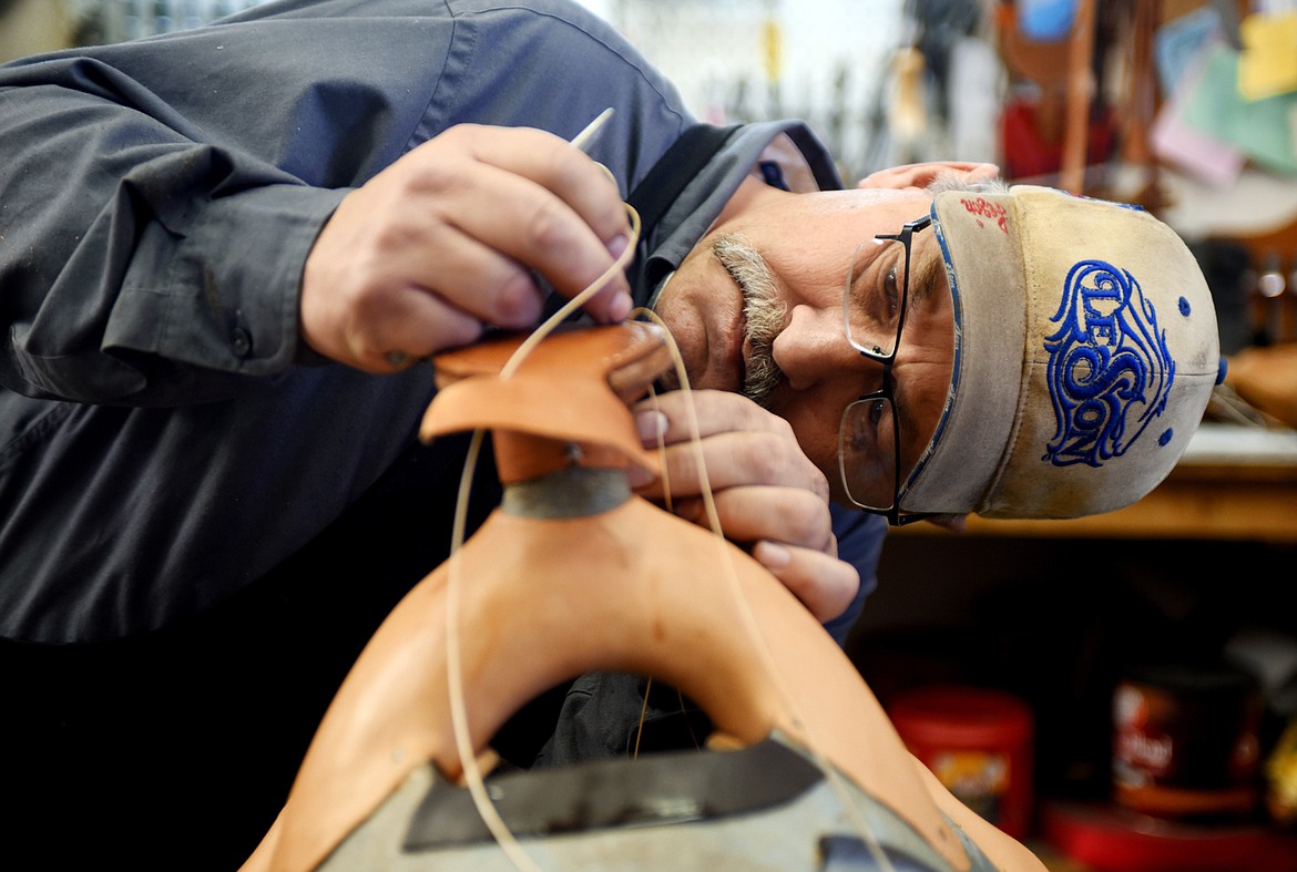 Don Thompson works with a pair of well-worn, broken-in boots at Valley Boot and Saddle in Kalispell.(Brenda Ahearn/Daily Inter Lake)