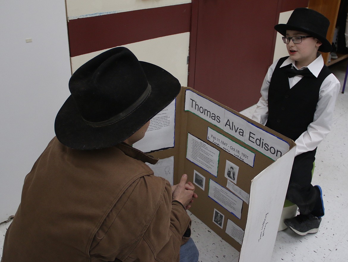 For the older kids in grades four through six, explorers, inventors and world history was the theme. Thomas Edison, Laura Ingalls Wilder, and Christopher Columbus were just a few of the historic figures in the final museum event of the night. Aspen Ames, who chose to represent Margaret Morse Nice, said she is famous as a bird scientist and zoologist. Nice was a “very bright person,” Aspen said, and she was impressed by how much Nice had learned about birds from studying them for so many years.