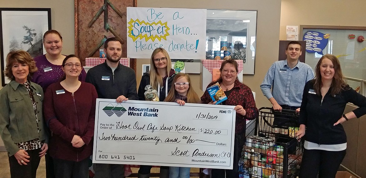 Mountain West Bank in Ponderay recently held an event to raise funds for the Ponderay Soup Kitchen. Customers and employees donated cash and food items to provide assistance to this free service at Hoot Owl Café every Monday from 4-7 p.m.