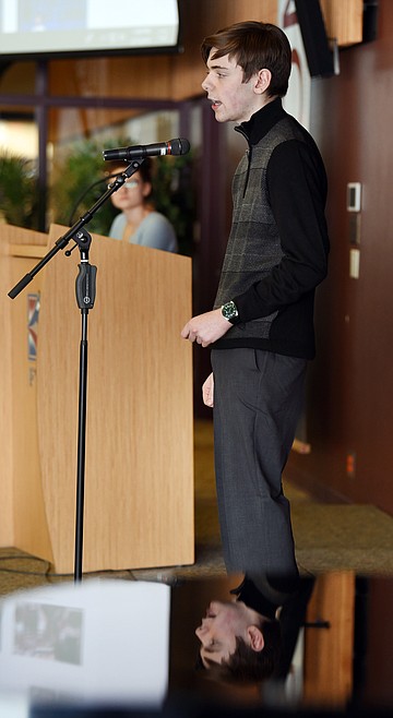 Derrick Neater of Flathead High School recites "A Poison Tree" by William Blake in round one of the Montana Arts Council Poetry Out Loud high school competition, on Thursday afternoon, February 7, at Flathead Valley Community College.(Brenda Ahearn/Daily Inter Lake)